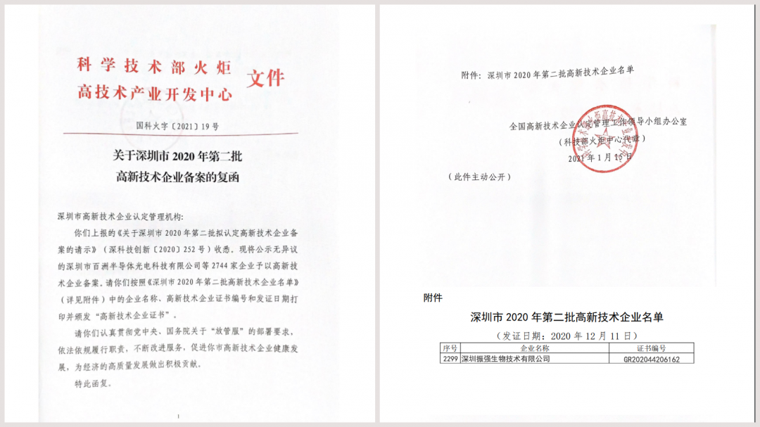 深圳振强生物技术有限公司顺利通过“高新技术企业”资质认证,荣获2020年国家高新技术企业证书。